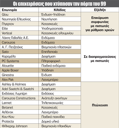 Μπάμπης Βωβός Διεθνής Τεχνική, Fokas, Sato, Neoset. Είναι μερικά μόνον από τα πιο ηχηρά ονόματα του εγχώριου επιχειρείν που, υπό το βάρος των υπέρογκων χρεών, υπέβαλαν το 2012 αίτηση ένταξης στο άρθρο 99. Πρόκειται, ίσως, για την πιο δημοφιλή διάταξη του ελληνικού Δικαίου, στις αγκάλες της οποίας από το 2007 έχουν προσφύγει περισσότερες από 1.000 εταιρείες.