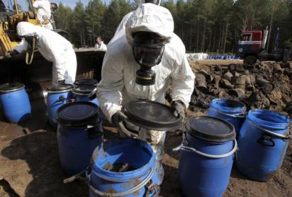 Περί τους 640 τόνους παρασιτοκτόνων, συμπεριλαμβανομένου του DDT, ανασύρθηκαν από περιοχή ταφής αποβλήτων νοτιοδυτικά του Μινσκ στην Λευκορωσία, εξαιτίας περιβαλλοντικής ρύπανσης. Vasily Fedosenko / Reuters