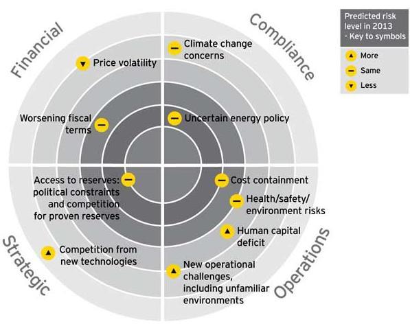 1. Πρόσβαση στα αποθέματα: Οι πολιτικοί περιορισμοί και ο ανταγωνισμός για τα αποδεδειγμένα αποθέματα ασκούν πιέσεις. Σύμφωνα με έρευνα της Ε&Υ, οι πολιτικοί παράγοντες επηρεάζουν τον κλάδο των υδρογονανθράκων περισσότερο από άλλους κλάδους.