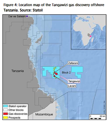 Η νεότερη ανακοίνωση στην Τανζανία έγινε από τη Statoil με την ανακάλυψη ποσότητας 4-5 τρις. κ.π. φυσικού αερίου στη γεώτρηση Tangawizi, 1.100 χμ από τις ακτές της χώρας και σε βάθος νερού 2.300 μέτρων. Με την προσθήκη αυτή, τα αποθέματα του οικοπέδου 2 αυξάνονται σε 10-13 τρις. κ.π., ενώ η εταιρεία φιλοδοξεί να κατασκευάσει σταθμό LNG, κόστους 14 δις. δολαρίων.