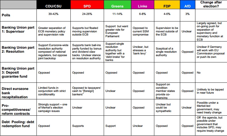 «Η πολιτική της Γερμανίας για την ευρωζώνη έχει μια βασική τροχιά, που είναι απίθανο να αλλάξει μετά τις 22 Σεπτεμβρίου, ανεξάρτητα από το ποιος είναι στην εξουσία. Αν κυβερνά ένας συνασπισμός στον οποίο συμμετέχει το SPD, τότε μπορεί στην ιδιοσυγκρασία του να είναι πιο φιλικός προς τις χώρες της ευρωζώνης που αντιμετωπίζουν δυσκολίες, αλλά από την άποψη της πραγματικής πολιτικής, η κύρια επιμονή της Γερμανίας ως προς τη λιτότητα είναι πιθανό να παραμείνει αμετάβλητη».