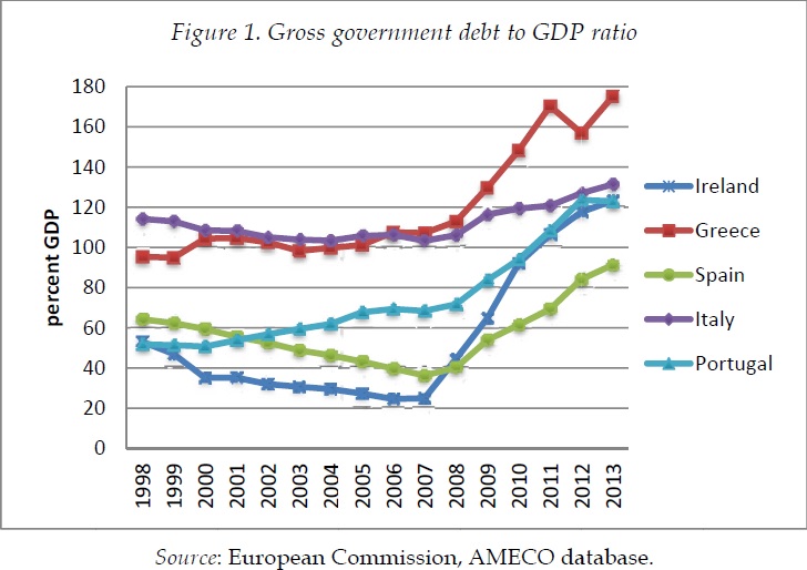 Το πιο εντυπωσιακό χαρακτηριστικό της λιτότητας και της κληρονομιάς της είναι ότι παρά την ένταση των προγραμμάτων, δεν υπάρχει καμία απόδειξη ότι έχουν αυξήσει την ικανότητα των κυβερνήσεων των οφειλετριών χωρών να συνεχίσουν την εξυπηρέτηση των χρεών τους. Στο Σχήμα 1 εμφανίζουμε τα ποσοστά των κυβερνητικών χρεών των οφειλετριών χωρών. Επισημαίνεται ότι ενώ το επίπεδο χρέους άρχισε να αυξάνεται το 2008 ως αποτέλεσμα της τραπεζικής κρίσης, τα προγράμματα λιτότητας που τέθηκαν σε εφαρμογή μετά από το 2010, δεν φαίνεται να έχουν συμπεριλάβει την εκρηκτική ανάπτυξη των ποσοστών κρατικού χρέους (πιθανή εξαίρεση είναι η Ιρλανδία).