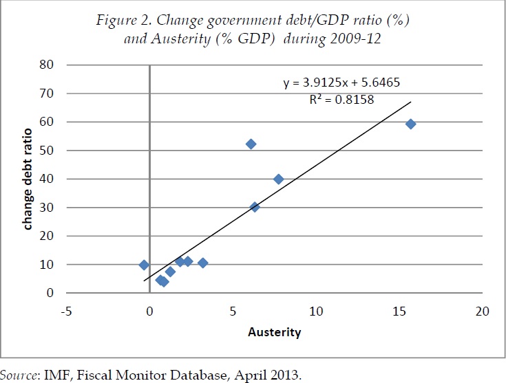 Διερευνούμε το ζήτημα περαιτέρω στο Σχήμα 2. Απεικονίζουμε τον βαθμό της λιτότητας (όπως μετράται από την αλλαγή στον κυκλικά προσαρμοσμένο πρωτογενές προϋπολογισμό) στον οριζόντιο άξονα, στη διάρκεια της περιόδου 2009-2012. Παρατηρούμε έναν πολύ ισχυρό θετικό συσχετισμό, δηλαδή πιο έντονα προγράμματα λιτότητας συμπίπτουν με την αύξηση του ποσοστού του κρατικού χρέους. Ο υποκείμενος μηχανισμός έχει αναγνωριστεί καλά από τις ημέρες του Irvin Fisher (1993). Η ύφεση που επικράτησε στις νότιες χώρες ήταν μια «ύφεση ισολογισμού» όπου οι ιδιώτες προσπάθησαν απεγνωσμένα να μειώσουν το επίπεδο χρέους τους. Όταν, με την επιμονή της Κομισιόν και των πιστώτριων χωρών, οι κυβερνήσεις των νότιων χωρών υποχρεώθηκαν επίσης να προχωρήσουν σε απομόχλευση, οι δυναμικές αποπληθωρισμού λόγω χρέους τέθηκαν σε λειτουργία, οδηγώντας σε βαθιές υφέσεις –που σε κάποιες χώρες θύμισαν ακόμη και τις υφέσεις της δεκαετίας του 1930.
