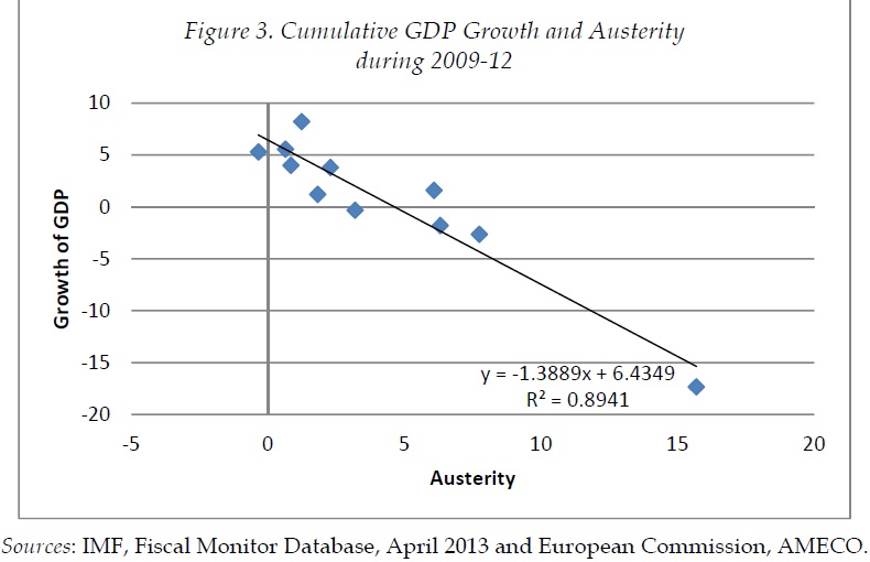 Δείχνουμε τη φύση αυτής της αποπληθωριστικής διαδικασίας στο Σχήμα 3, όπου παρουσιάζουμε το ίδιο μέτρο λιτότητας στον οριζόντιο άξονα και την πτώση του ΑΕΠ στη διάρκεια της ίδιας περιόδου (2009-2012). Παρατηρούμε μια ισχυρά αρνητική σχέση δηλαδή, όσο ισχυρότερο είναι το πρόγραμμα λιτότητας, τόσο βαθύτερη είναι η πτώση στο ΑΕΠ. Η εκτιμώμενη εξίσωση υποδηλώνει ότι κατά μέσο όρο για κάθε 1% αύξηση της λιτότητας, η παραγωγή υποχωρεί κατά 1,4%. Αυτό είναι σύμφωνο με τα αποτελέσματα που έχουν λάβει άλλοι αναλυτές και το ΔΝΤ, υποδηλώνοντας ότι ο δημοσιονομικός πολλαπλασιαστής υπερβαίνει το 1.
