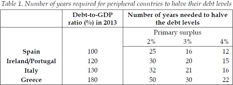 Στον παρακάτω πίνακα εμφανίζουμε τι σημαίνει «προσωρινό». Ο πίνακας υπολογίζει τον αριθμό των ετών που θα χρειαστούν οι περιφερειακές χώρες με υψηλά επίπεδα χρέους για να μειώσουν στο ήμισυ αυτά τα επίπεδα. Δείχνουμε τα αποτελέσματα κάτω από σχετικά ευνοϊκές μακροοικονομικές συνθήκες, δηλαδή υποθέτοντας ότι το ονομαστικό επιτόκιο του χρέους έχει υποχωρήσει και ισούνται με την ονομαστική ανάπτυξη του ΑΕΠ (μια προϋπόθεση που δεν έχει ακόμη επιτευχθεί σε αυτές τις χώρες). Ο πίνακας εμφανίζει ότι ακόμη και όταν αυτές οι χώρες κατορθώσουν να διατηρήσουν ένα υψηλό πρωτογενές πλεόνασμα της τάξης του 4% για πολλά χρόνια (που σήμερα δεν το επιτυγχάνουν καθόλου), ακόμη και έτσι θα χρειαστεί μεταξύ 12-22 χρόνια για να μειωθεί κατά το ήμισυ το χρέος. Στην πραγματικότητα, με εξαίρεση την Ιρλανδία, αυτές οι χώρες δεν είναι καν ακόμη ικανές να σταθεροποιήσουν τα επίπεδα χρέους, έτσι οι αριθμοί στον πίνακα υποτιμούν τον αριθμό των ετών που θα χρειαστούν για να «κόψουν» αυτά τα επίπεδα χρέους. Το ζήτημα είναι εάν τα πολιτικά τους συστήματα έχουν αρκετή αντοχή για να συντηρήσουν τέτοια «προσωρινά» προγράμματα λιτότητας, προκειμένου να οδηγήσουν χαμηλότερα αυτά τα επίπεδα χρέους, αργά και βασανιστικά.
