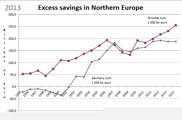 Η τάση προς την επανεθνικοποίηση μπορεί να ειδωθεί ξεκάθαρα στο παρακάτω σχήμα. Μέχρι περίπου το 2008, οι διασυνοριακές απαιτήσεις των τραπεζών του πυρήνα της ευρωζώνης (κυρίως της Γερμανίας και των μικρότερων γειτόνων της) προς την περιφέρεια της ευρωζώνης, αυξανόταν γρήγορα, πολλαπλασιαζόμενα αρκετές φορές. Αλλά από το τέλος της πιστωτικής έκρηξης το 2008, έχουν υποχωρήσει από περίπου 16 τρις. ευρώ σε μικρότερο από το μισό αυτού του ποσού.