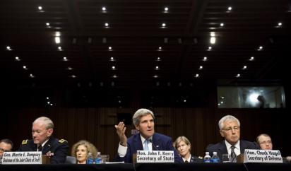 Ο Martin Dempsey, ο John Kerry και ο Chuck Hagel καταθέτουν ενώπιον του Κογκρέσου. (Joshua Roberts / Courtesy Reuters.)
