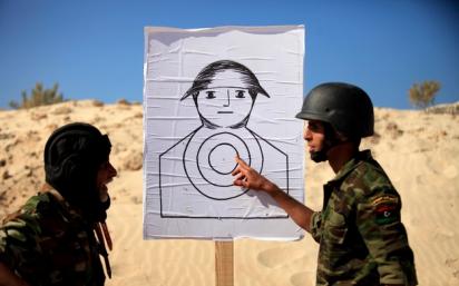 Ένας εκπαιδευόμενος του Λιβυκού Στρατού συνομιλεί με τον διοικητή του μπροστά από έναν στόχο στην διάρκεια των εξετάσεών του στο όπλο Geminis, στις 30 Οκτωβρίου 2013. (Esam Omran Al-Fetori / Reuters)