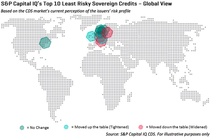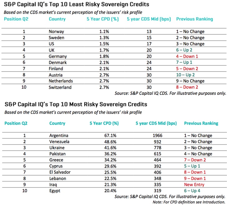 Η Standard & Poor’s δημοσίευσε προσφάτως την παγκόσμια έκθεσή της για κρατικό χρέος για το δεύτερο τρίμηνο του 2014. Η έκθεση κατατάσσει τις χώρες ανάλογα με τον βαθμό επικινδυνότητας του χρέους της, που απεικονίζει ένα χάσμα Βορρά-Νότου στην πιστοληπτική ικανότητα, με τη Νορβηγία να είναι η λιγότερο (επικίνδυνη) και η Αργεντινή η περισσότερο (επικίνδυνη). Τη Νορβηγία ακολουθούν η Σουηδία και οι ΗΠΑ, ενώ το Ηνωμένο Βασίλειο βρίσκεται στην τέταρτη θέση, την οποία συνήθως καταλάμβανε η Γερμανία.