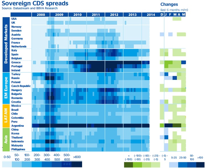 Ωστόσο, η αξιοπιστία των CDSs ως δείκτες κρατικού χρέους συχνά αμφισβητούνται, και από το ΔΝΤ, εξαιτίας της σχετικά χαμηλής ρευστότητας σε ένα τμήμα της αγοράς. Επιπλέον, όπου τα στοιχεία CDSs για το κράτος δεν είναι διαθέσιμα, η S&P χρησιμοποιεί μια κρατική τράπεζα ως υποκατάστατο για να υπολογίσει τα CDSs και συνεπώς το CPD της χώρας. Αυτό συμβαίνει με την Ινδία, για την οποία χρησιμοποιούνται τα στοιχεία από την «State Bankof India» και για την Τυνησία, για την οποία χρησιμοποιούνται από τα δεδομένα της Baque Centrale de Tunisie. Το σχήμα 2 παρακάτω (από έρευνα της BBVA) εμφανίζει την χρονολογική εξέλιξη των CDSs σε όλες τις χώρες παγκοσμίως, και υποδηλώνει ότι εκτός από την περίπτωση της Νορβηγίας από τη μια πλευρά και της Ελλάδας και της Αργεντινής από την άλλη, ταCDSs δεν αποδίδουν πάντα μια αμφιλεγόμενη κατάταξη.