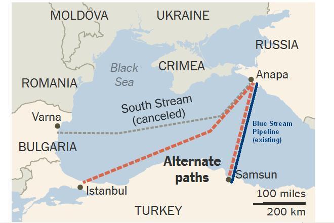 Εν όψει των αντίξοων αυτών συνθηκών αλλά και λόγω του αυξανόμενου κόστους κατασκευής του South Stream, ο προϋπολογισμός του οποίου είχε υπερβεί τα $30.0 δισεκατομμύρια, και της παράλληλης μείωσης των τιμών του αργού (πτώση κατά 60% σε διάστημα 8 μηνών), η Gazprom απεφάσισε να εγκαταλείψει το αρχικό σχέδιο και να προσανατολισθεί σ’ ένα μικρότερου μήκους αγωγό, πάλι μέσω Μαύρης Θάλασσας, παρακάμπτοντας όμως εντελώς την Βουλγαρία η οποία με την συμπεριφορά της έδειξε ασυνέπεια ως προς την αρχική της συμφωνία και δεσμεύσεων της έναντι της εταιρείας. Η νέα χάραξη του αγωγού προβλέπει προσαιγιάλωση μερικά χιλιόμετρα βόρεια της Κωνσταντινούπολης, στον οικισμό Καγιάκεϊ επί της Ευρωπαϊκής Τουρκίας, και από εκεί κατεύθυνση προς τα Ελληνινο-Τουρκικά σύνορα, όπου ως γνωστό λειτουργεί από το 2007 ο Ελληνο-Τουρκικός interconnector. Μάλιστα σύμφωνα με τελευταίες πληροφορίες ως σημείο διάβασης του αγωγού στο ελληνικό έδαφος προτείνεται η τοποθεσία Έψιλα επί των ελληνοτουρκικών συνόρων στον Έβρο.