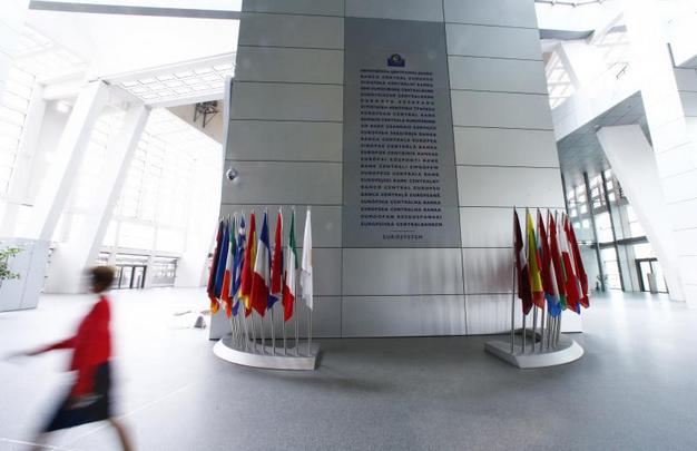 Μια γυναίκα βαδίζει στον προθάλαμο της έδρας της Ευρωπαϊκής Κεντρικής Τράπεζας (ECB) στην Φρανκφούρτη, στις 23 Ιουνίου 2015. RALPH ORLOWSKI / REUTERS