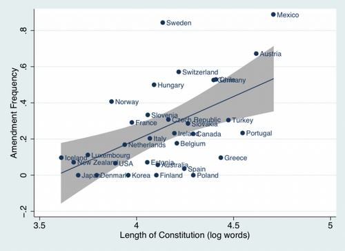 Αριθμός συνταγματικών τροποποιήσεων προς Μέγεθος συντάγματος