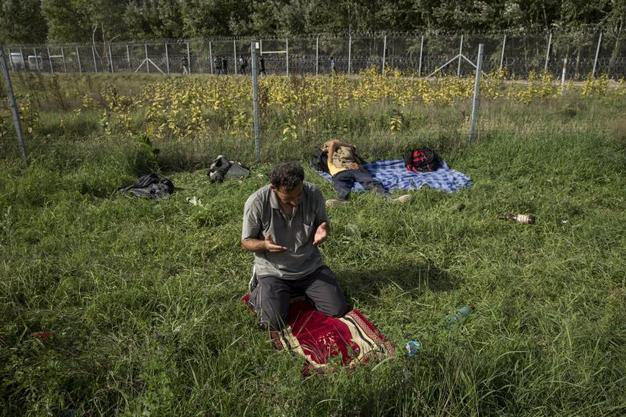 Ένας μετανάστης προσεύχεται κοντά στα συνοριακό φράχτη με την Ουγγαρία στο Χοργκός, στην Σερβία, τον Σεπτέμβριο του 2015. MARKO DJURICA / REUTERS