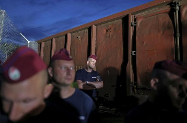Ούγγροι αστυνομικοί φρουρούν ένα βαγόνι που χρησιμοποιείται για να σφραγίζει τα σύνορα με την Σερβία κοντά στο χωριό Röszke, στην Ουγγαρία, στις 14 Σεπτεμβρίου 2015. DADO RUVIC / REUTERS